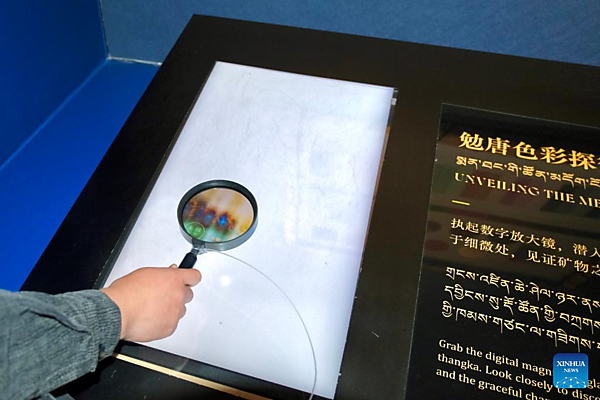 | This photo taken on Oct. 21, 2025 shows an interactive device at a thangka art exhibition in the Xizang Museum in Lhasa, southwest China's Xizang Autonomous Region. [Xinhua/Zhou Yulong] |