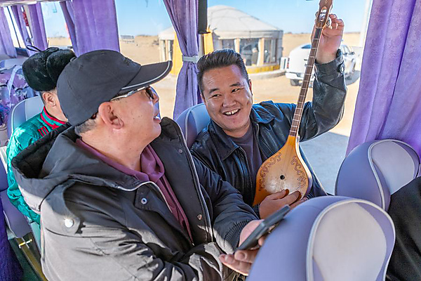 | Oyunjargal (R) demonstrates playing skill on a bus heading for a performance in the countryside in Sonid Right Banner of Xilingol League, north China's Inner Mongolia Autonomous Region, Nov. 12, 2025. [Xinhua/Ma Jinrui] |