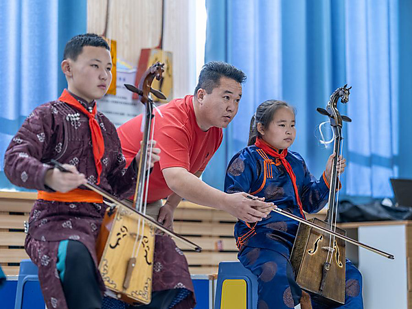 | Oyunjargal (C) instructs students in playing the morin khuur at a primary school in Sonid Right Banner of Xilingol League, north China's Inner Mongolia Autonomous Region, Nov. 13, 2025. [Xinhua/Ma Jinrui] |