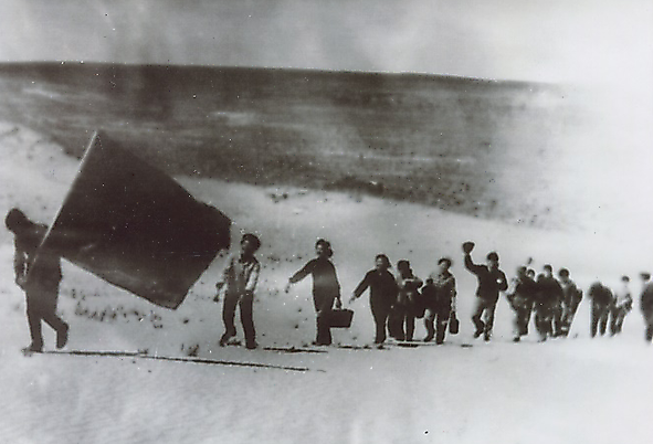 | This file photo shows actors of the Ulan Muqir art troupe of the Sonid Right Banner on their way to perform amid wind and snow in the 1970s. [Xinhua] |