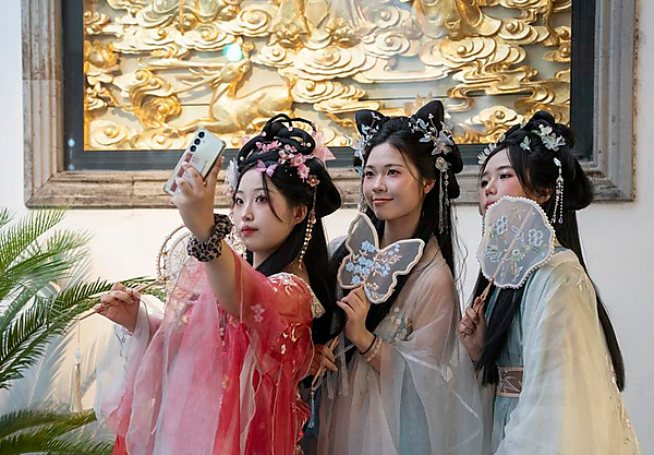 | Tourists from South Korea wearing Hanfu attires take a selfie at Yuyuan Garden Mall in Shanghai, east China, July 21, 2025. [Photo by Zhang Yue/Xinhua] |