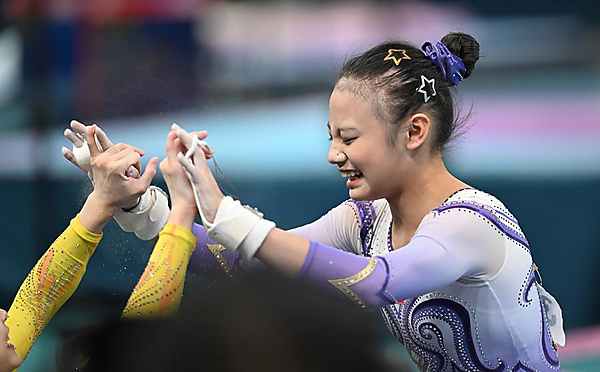 | Qiu celebrates after her silver-medal performance in the women's uneven bars final at the 2024 Olympic Games at the Bercy Arena in Paris, France, on Aug. 4, 2024. [Xinhua/Cheng Min] |