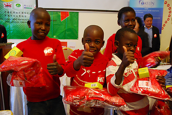 | African children wear sweaters knitted by caring Chinese. In 2010, 2,010 sweaters and 2,010 T-shirts were donated to African children. |
