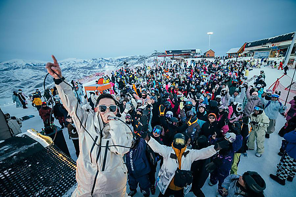 In late January, a cold wave still gripped northern Xinjiang. Temperatures on the summit of Jiangjunshan International Ski Resort drop below minus 20 degrees Celsius. Yet at sunset, hundreds of skiers and tourists gather near a DJ stage, dancing in colorful gear as pink and blue light washes over the snowy peaks.