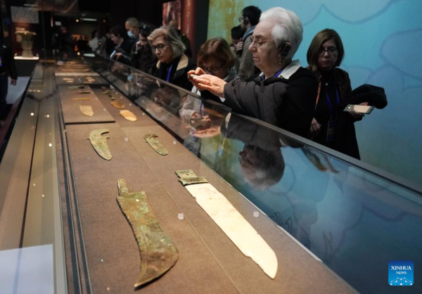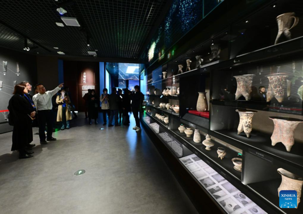 | Guests visit the exhibition titled "Origins of Chinese Civilization from an Archaeological Perspective" at the Chinese Archaeological Museum in Beijing, capital of China, Nov. 6, 2024. More than 300 Chinese and foreign guests on Wednesday visited the exhibition, one of the auxiliary activities of the World Conference of Classics scheduled from Nov. 6 to 8 in Beijing. [Xinhua/Zhang Chenlin] |
