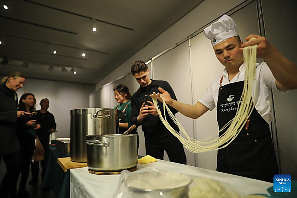 | Photo taken on Nov. 11, 2025, shows a live demonstration of Lanzhou beef noodle making at the Chinese Cultural Center in Berlin, Germany. [Xinhua/Du Zheyu] |