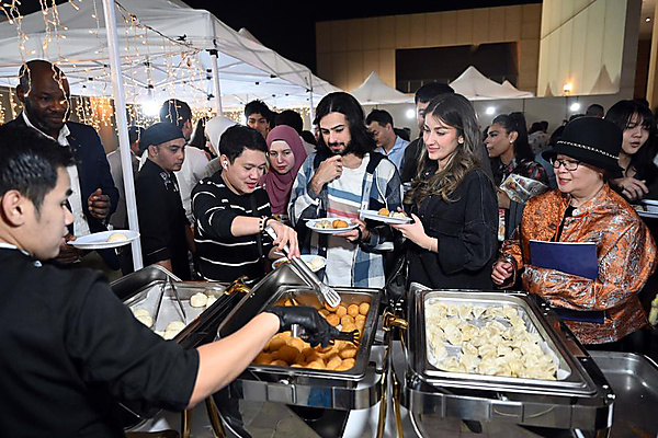 | People enjoy Chinese food during the Chinese culture night event at the Chinese Embassy in Kuwait in Hawalli Governorate, Kuwait, Nov. 26, 2025. [Photo by Asad/Xinhua] |