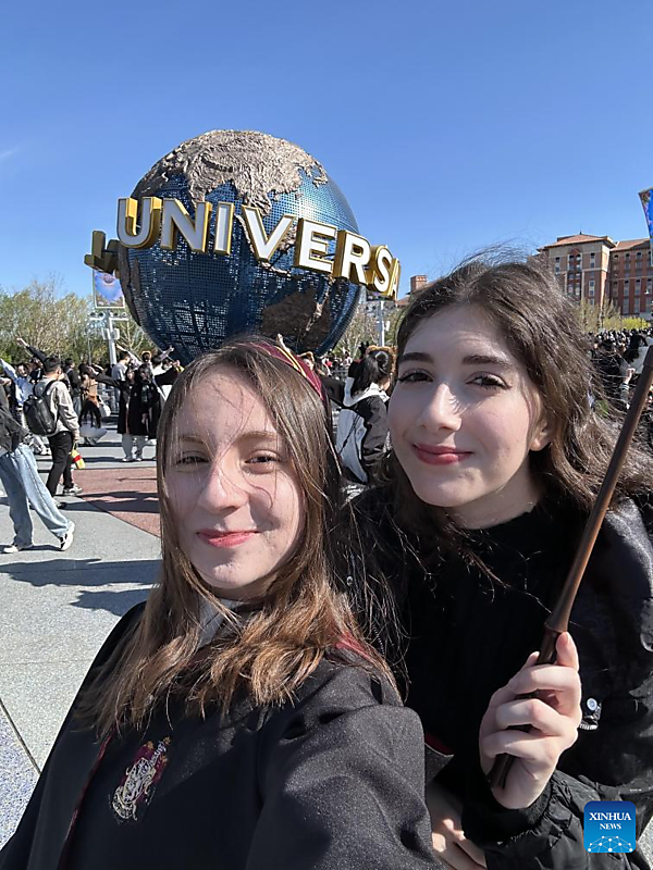 | Türkan Hamza (R), a Turkish student majoring in Chinese-English translation, poses for photos with her friend at the Universal Beijing Resort in Beijing, capital of China, April 5, 2025. [Xinhua] |