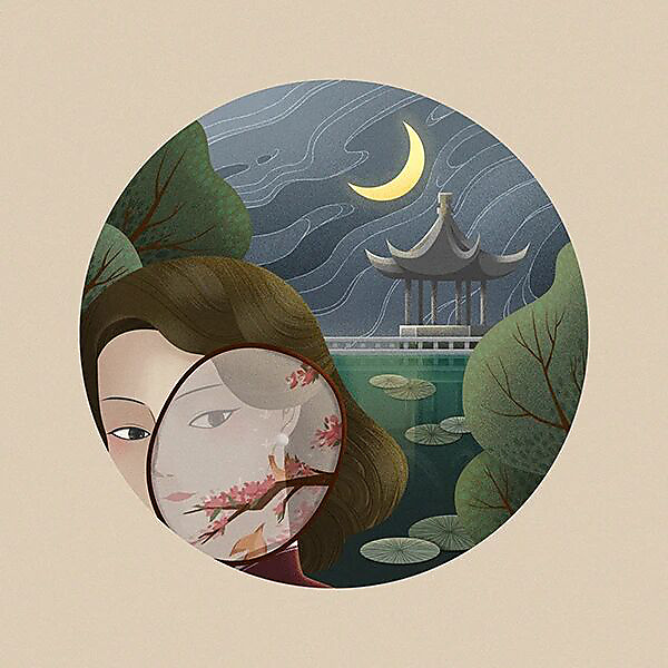 Each of the three circular illustrations carries its own charm: The first depicts a woman, in qipao, holding a fan under the moon; the second, a half-hidden face, behind a round fan, set against a garden pavilion; and, the third, a woman’s figure, glimpsed through lattice windows.