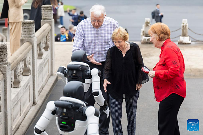 | Participants of the China-U.S. Ping-Pong Diplomacy interact with robots at Shanghai University of Sport in Shanghai, east China, April 13, 2026. [Xinhua/Wang Xiang] |