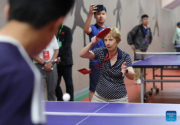 | Connie Sweeris, a participant of the China-U.S. Ping-Pong Diplomacy, plays in a table tennis friendly match with a student in Shijiazhuang, north China's Hebei Province, April 11, 2026. [Xinhua/Lu Ye] |