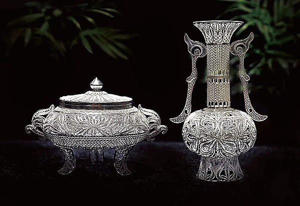 The tools used to make silver-filigree crafts are basic, and simple: Tweezers, scissors, a high-temperature-resistant asbestos board, a welding torch and a hammer. The silver threads — whether thick or thin — are shaped to form housewares, such as vases, plates, incense containers and boxes. The threads can also be made into ornaments, such as hairpins, eardrops, brooches and bracelets. Makers of the crafts demonstrate their aesthetic tastes, and their excellent skills, by utilizing the delicate, silver threads to both form the shapes and fill the inner designs of the crafts.