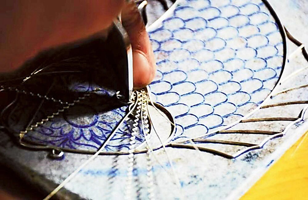 When the silver threads are ready, the patterns are placed on a high-temperature-resistant asbestos board, and then, the threads are shaped to the craft and used to fill the craft's inner design.