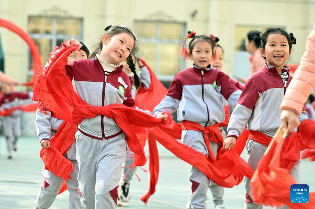 Children perform traditional Yangge dance at a kindergarten in Shijiazhuang, north China's Hebei Province, Feb. 21, 2023. [Xinhua/Luo Xuefeng]