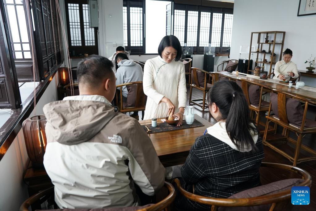 Young customers drink tea at a teahouse in Huangshan City, east China's Anhui Province, on March 9, 2023.