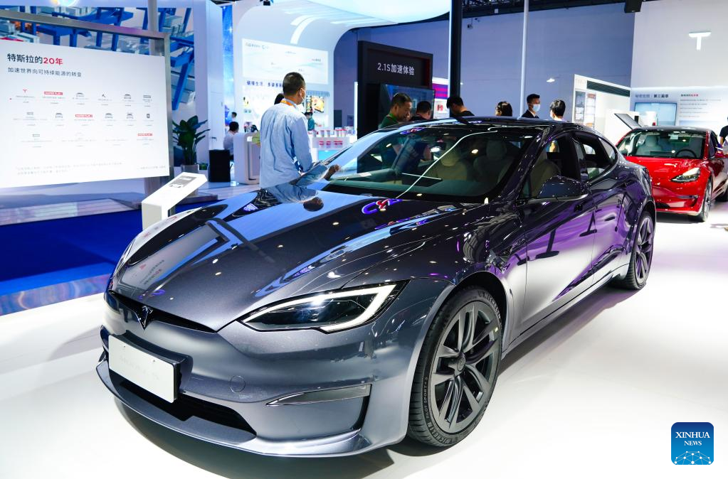 A Tesla car is displayed at the third China International Consumer Products Expo (CICPE) in Haikou, capital city of south China's Hainan Province, April 11, 2023. Green and low-carbon production and consumption concepts can be found in many exhibition areas of the third CICPE. [Xinhua/Fan Yuqing]