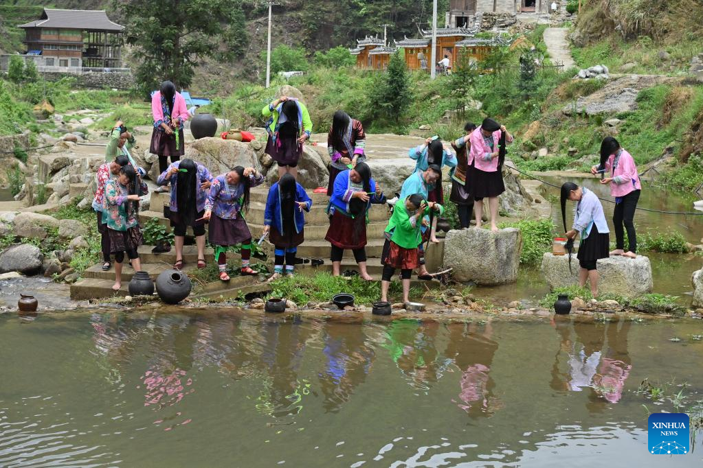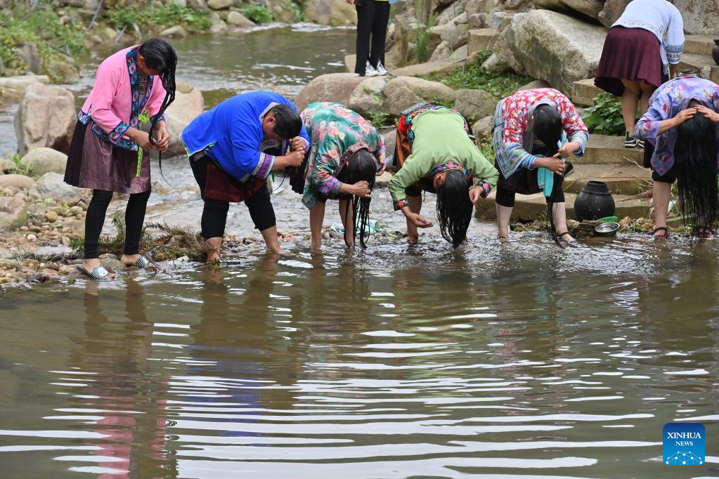 Women wash their hair at the riverside to celebrate the upcoming Sanyuesan Festival in Dangjiu Village, Gandong Township, Rongshui Miao Autonomous County, south China's Guangxi Zhuang Autonomous Region, on April 19, 2023. People held various events to celebrate the Sanyuesan Festival which falls on the third day of the third lunar month. [Xinhua/Huang Xiaobang]