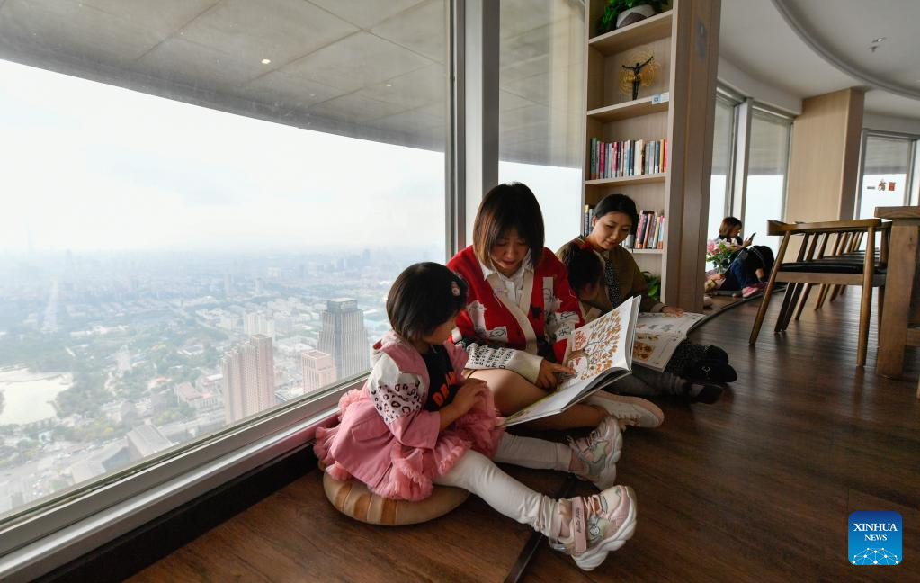 People read books at a bookstore in the Tianjin Television Tower in Hexi District of Tianjin, north China, April 22, 2023. Hexi District in north China's Tianjin Municipality has offered convenient reading service to its readers by developing a reading service system. With the system, libraries in the district can share their resources and readers can borrow and return books by one stop. [Xinhua/Sun Fanyue]