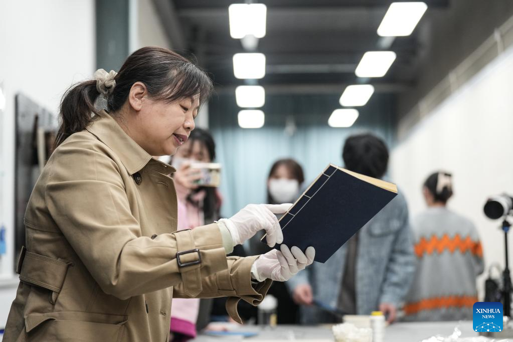 Wang Bin teaches students on thread-bound book making in Luxun Academy of Fine Arts in Shenyang City, northeast China's Liaoning Province, April 20, 2023. Liaoning Provincial Library, located in Shenyang City of northeast China's Liaoning, is home to a collection of 610,000 pieces of ancient books.