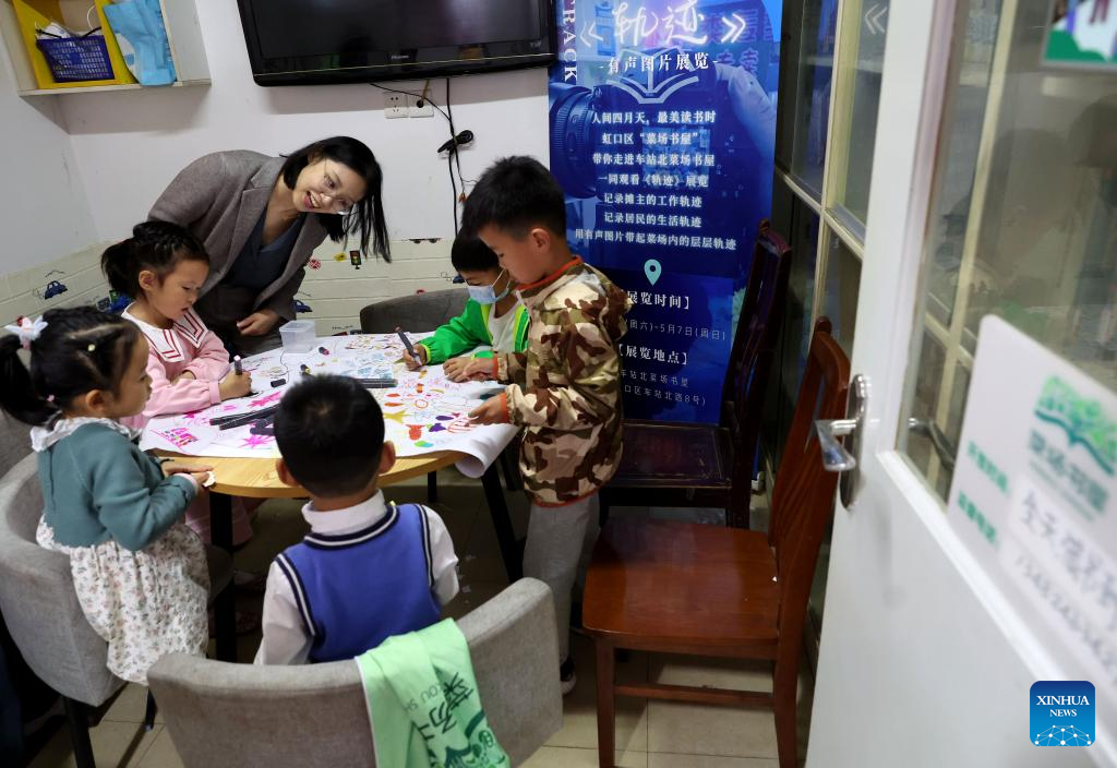 Children read a picture book at Kuizhao Road food market in Shanghai, east China, April 22, 2023. In 2010, the library of Shanghai Hongkou District provided about 600 books for migrant workers for free in Fuci food market in Jiangwanzhen Subdistrict. This was the first "food market reading space" in the district.