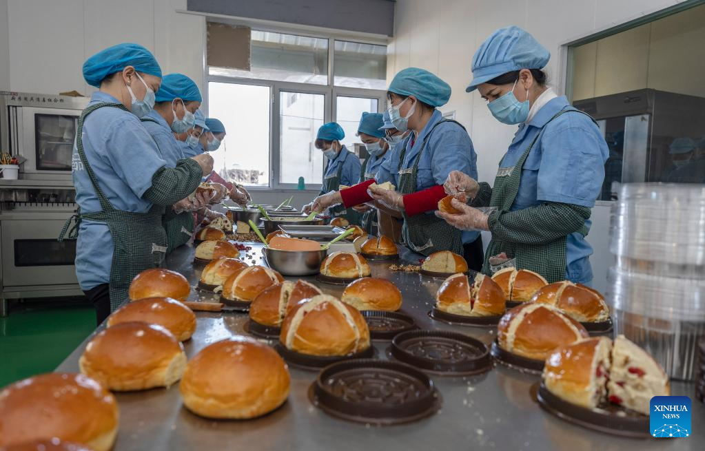 Employees make Tacheng cheese bread at the workshop of Jiangqu food company in Tacheng, northwest China's Xinjiang Uygur Autonomous Region, April 1, 2023. [Xinhua/Fei Maohua]