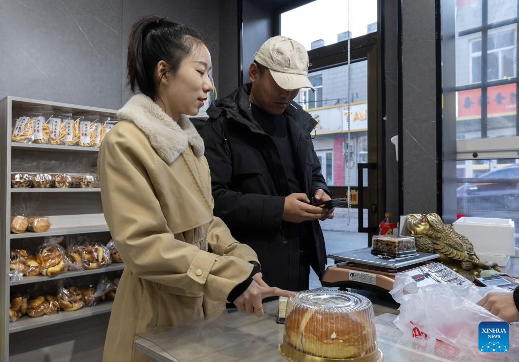 Costomers buy Tacheng cheese bread at a store in Tacheng, northwest China's Xinjiang Uygur Autonomous Region, April 1, 2023. [Xinhua/Fei Maohua]