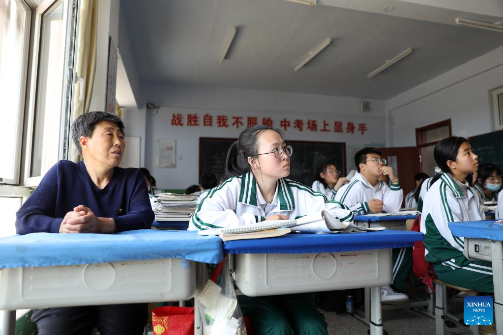 Zhang Lianqin (1st L) and Li Xinwei attend a class at the Hongyazi junior middle school in Hongyazi Township of Xingcheng City, northeast China's Liaoning Province, May 8, 2023. [Xinhua/Yao Jianfeng]