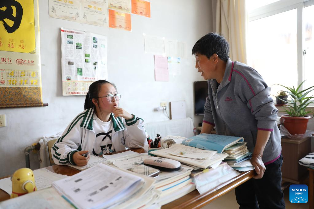 Zhang Lianqin (R) and Li Xinwei discusses the essay assignment at home in Hongyazi Township of Xingcheng City, northeast China's Liaoning Province, May 7, 2023. [Xinhua/Yao Jianfeng]