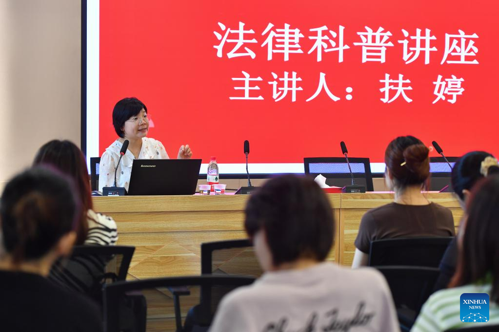 Fu Ting gives a legal lecture at Heping community in Yuhu District of Xiangtan, central China's Hunan Province, May 19, 2023. [Xinhua/Chen Zeguo]