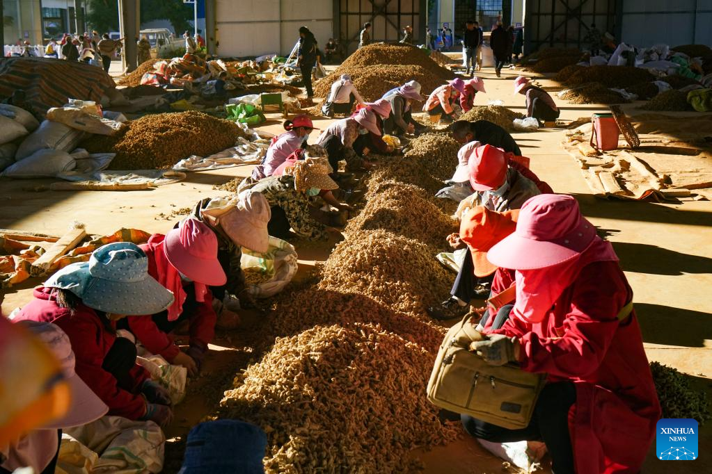 People sort panax notoginseng products at a market in Wenshan Zhuang and Miao Autonomous Prefecture, southwest China's Yunnan Province, Nov. 27, 2022. [Photo by Yang Denghong/Xinhua]