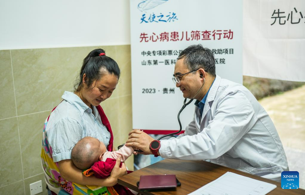 A medical expert from a hospital in Shandong examines a child at a traditional Chinese medicine hospital in Guanling Bouyei and Miao Autonomous County, southwest China's Guizhou Province, June 6, 2023. A four-day congenital heart disease (CHD) screening program has been carried out in Anshun City and Qiannan Bouyei and Miao Autonomous Prefecture of Guizhou since June 6. Children who are screened in accordance with surgical indications will be taken to Jinan for free surgical treatment. [Xinhua/Tao Liang]