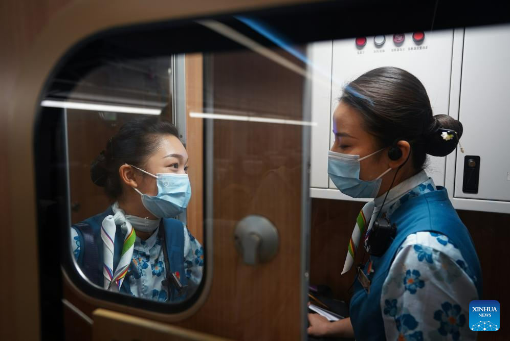 Yi Bofeng (L) talks with her colleague aboard the train D887 on July 16, 2023. [Xinhua/Chen Xinbo]