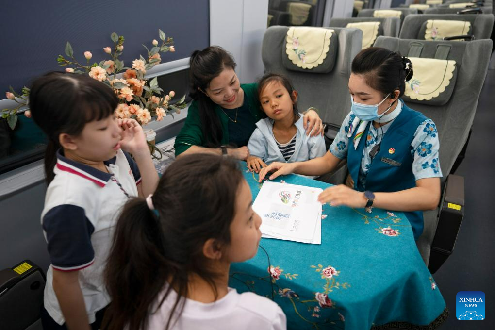 Yi Bofeng (R) interacts with passengers aboard the train D887 on July 16, 2023. [Xinhua/Chen Xinbo]