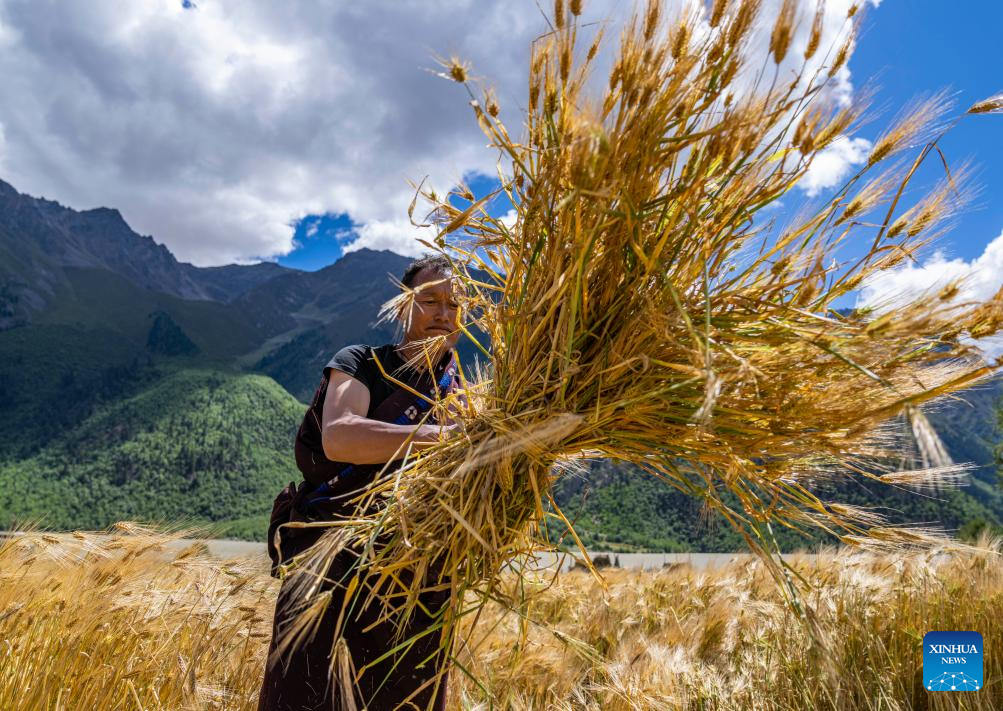 Villagers harvest highland barley in Waba Village of Ra'og Town of Qamdo City, southwest China's Tibet Autonomous Region, Sept. 4, 2023. [Photo by Tenzin Nyida/Xinhua]