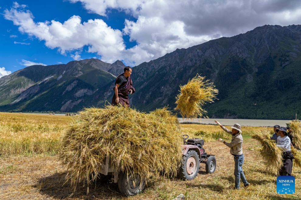 Villagers load highland barley onto a tractor in Waba Village of Ra'og Town of Qamdo City, southwest China's Tibet Autonomous Region, Sept. 4, 2023. [Xinhua/Sun Fei]