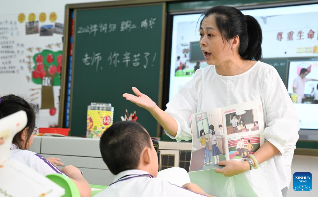 Fu Yaohui gives a class at Hainan (Haikou) Special School in Haikou, south China's Hainan Province, Sept. 5, 2023. [Xinhua/Yang Guanyu]