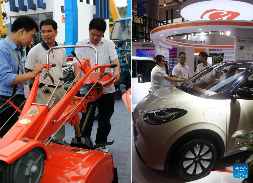 This combo photo shows people looking at a tractor at the 5th China-ASEAN Expo (L, photo taken by Xinhua photographer Liu Guangming on Oct. 25, 2008) and people looking at a car at the 20th China-ASEAN Expo (R, photo taken by Xinhua photographer Lu Boan on Sept. 18, 2023) in Nanning, south China's Guangxi Zhuang Autonomous Region. [Xinhua]
