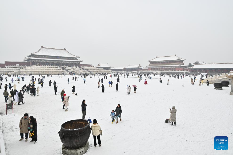 Tourists visit the Palace Museum in snow in Beijing, capital of China, Dec. 13, 2023. [Xinhua/Li Xin]