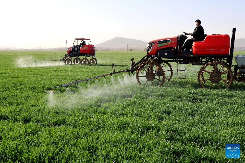 Farmers apply fertilizer on a wheat field in Dongying, east China's Shandong Province, March 19, 2024.