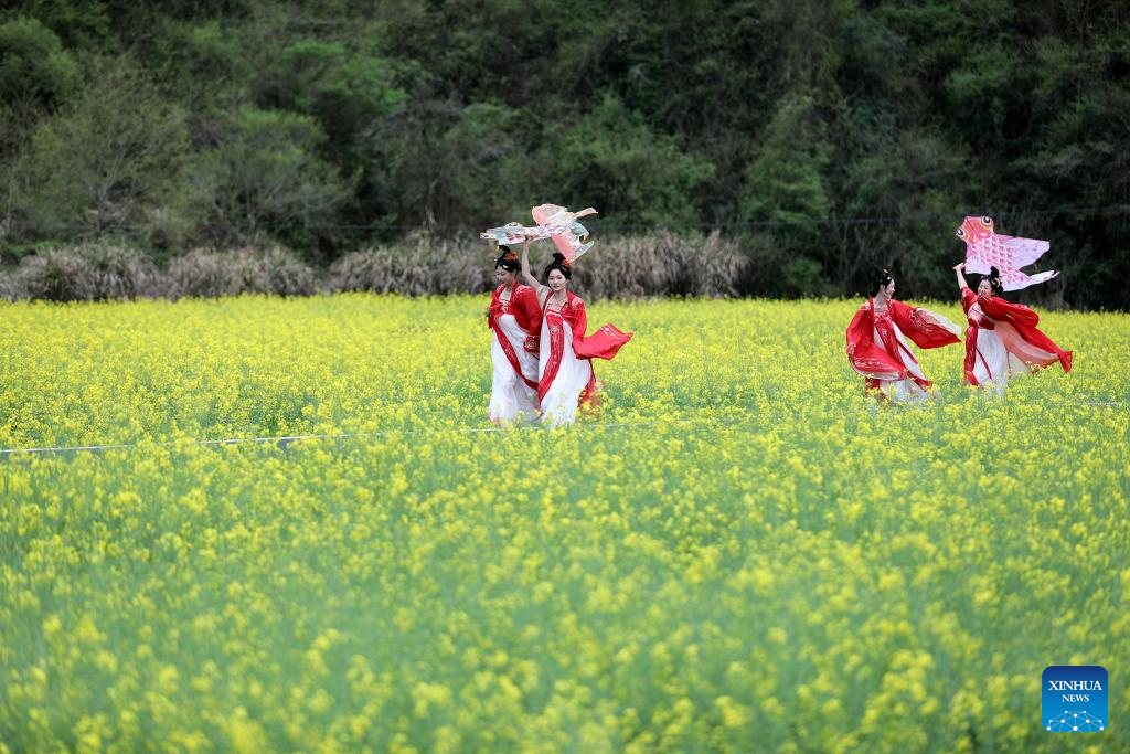 Tourists wearing traditional costumes fly kites in a cole flower field in Xiuning County of Huangshan City, east China's Anhui Province, March 31, 2024. [Photo by Fan Chengzhu/Xinhua]