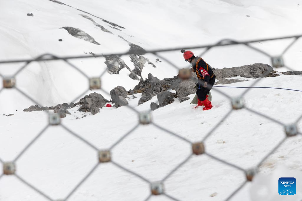 Lyu Haowei wipes his sweat away after working on a cliff at a glacier park of Yulong Snow Mountain in southwest China's Yunnan Province, March 26, 2024. [Xinhua/Jin Liwang]