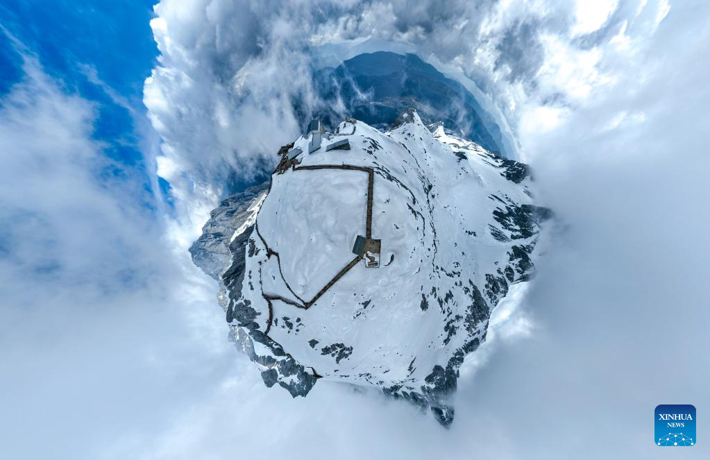 This spherical panorama taken with a drone on March 31, 2024 shows a view of a glacier park of Yulong Snow Mountain, southwest China's Yunnan Province. [Xinhua]