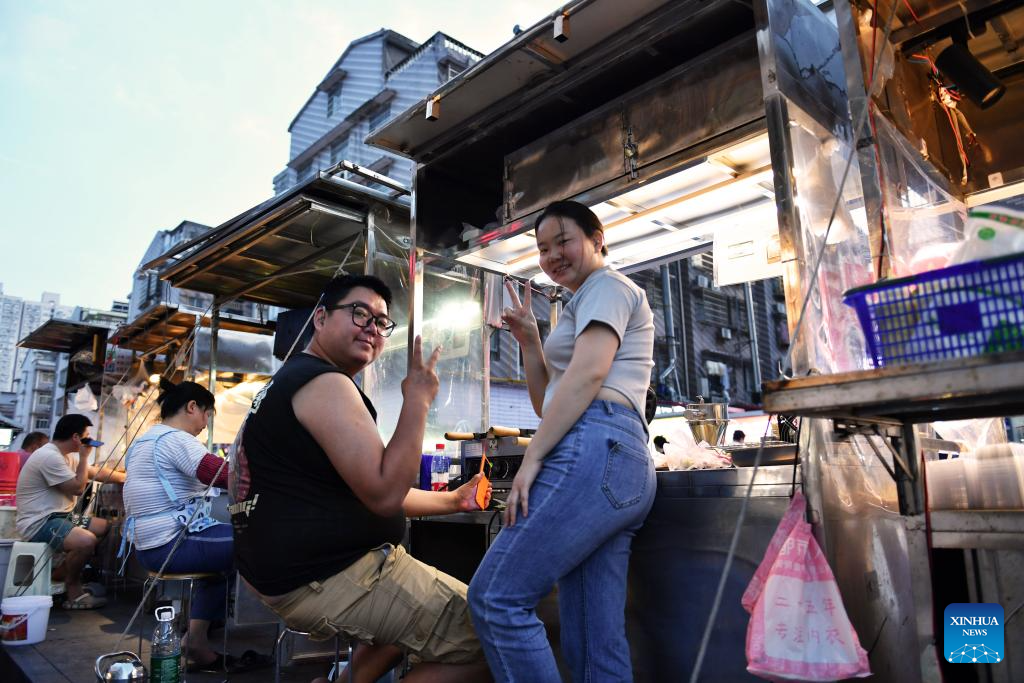 Zhang Yongsheng (R) moves his snack stall at Sifangping night market in Changsha, central China's Hunan Province, May 15, 2024. [Xinhua/Chen Zhenhai]