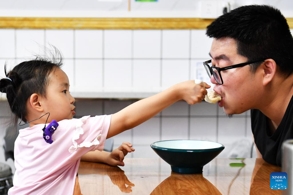 Daughter Zhang Yuhan plays with her father Zhang Yongsheng during supper at home in Changsha, central China's Hunan Province, May 15, 2024. [Xinhua/Chen Zhenhai]