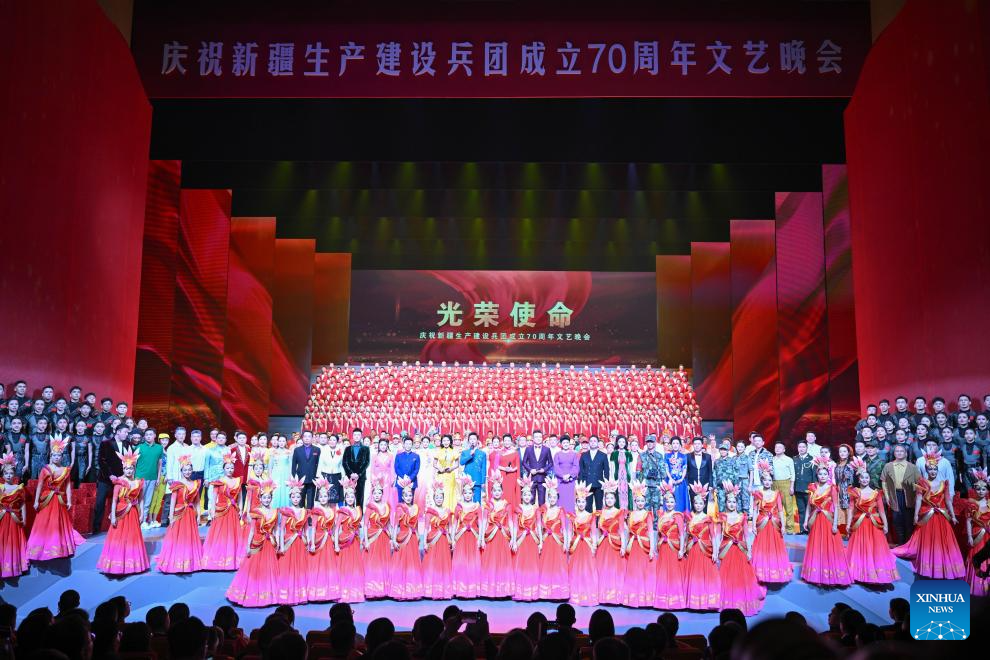 An artistic performance is staged to celebrate the 70th founding anniversary of the Xinjiang Production and Construction Corps in Urumqi, capital of northwest China's Xinjiang Uygur Autonomous Region, Oct. 6, 2024. [Xinhua/Li Xiang]