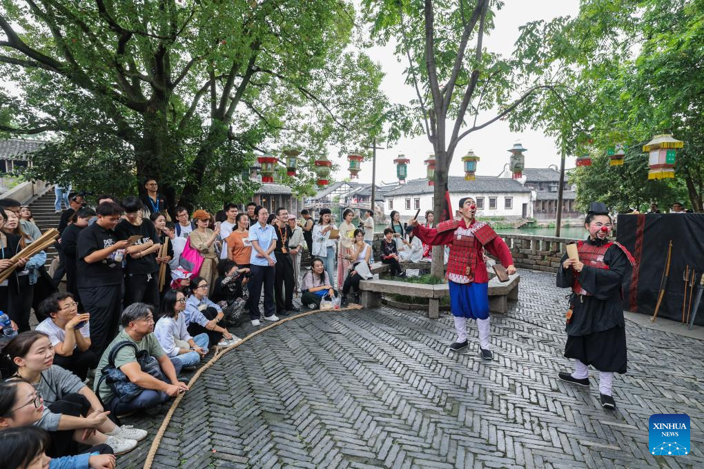 Tourists watch an open air performance during the 11th Wuzhen Theatre Festival in Wuzhen of Tongxiang City, east China's Zhejiang Province, Oct. 17, 2024. The 11th Wuzhen Theatre Festival kicked off Thursday in Wuzhen, featuring diversified performances and activities. [Xinhua/Xu Yu]