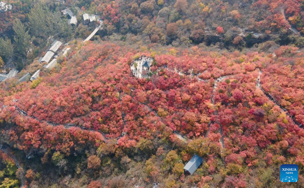 A drone photo taken on Oct. 29, 2024 shows a view of red leaves at the Pofengling scenic spot in Fangshan District of Beijing, capital of China. The scenic spot has ushered in the best time of the year to view red leaves. More than 100,000 plants there are greeting visitors with their flame-like new attire. [Xinhua/Chen Zhonghao]