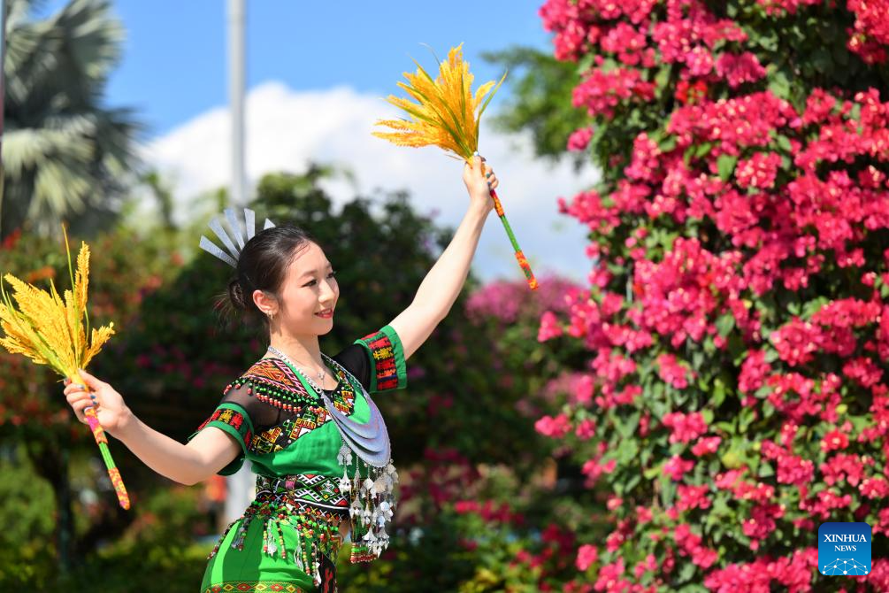 Artists welcome guests during a performance gala of the 12th National Traditional Games of Ethnic Minorities of China in Sanya, south China's Hainan Province, Nov. 26, 2024. [Xinhua/Zhang Bowen]