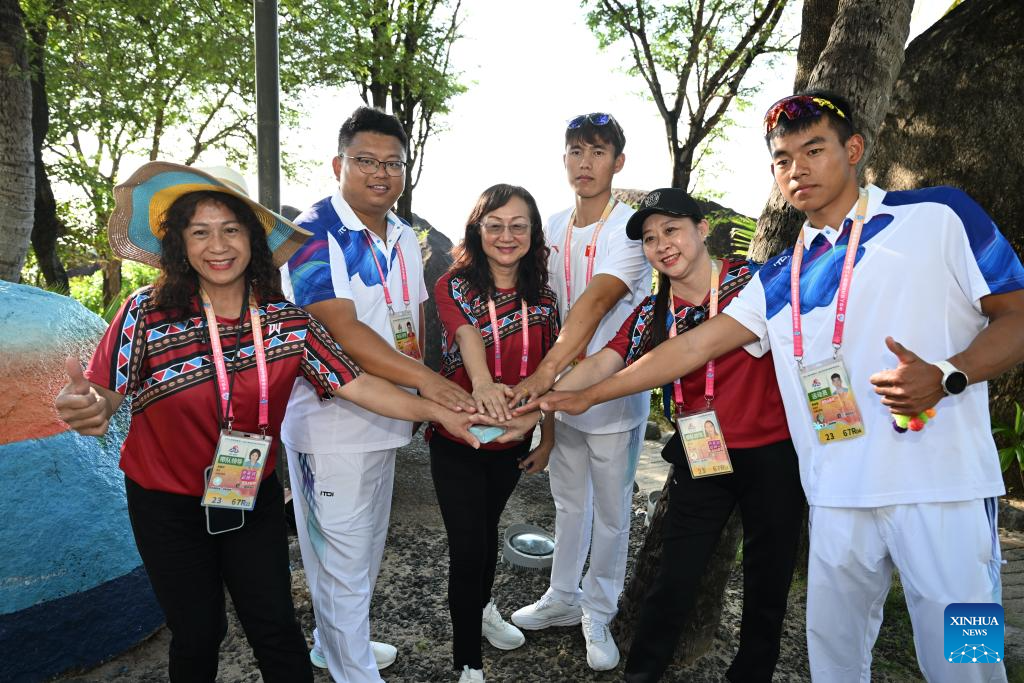 Members of Taiwan's delegation and Yunnan's delegation pose for a photo during a gala held at the 12th National Traditional Games of Ethnic Minorities of China in Sanya, south China's Hainan Province, Nov. 26, 2024. [Xinhua/Zhou Mu]