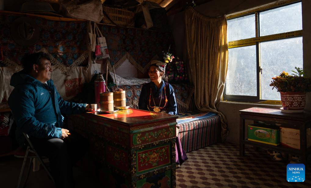 A Sherpa woman talks with a guest at her home in Zhentang Township, Dinggye County of Xigaze, southwest China's Xizang Autonomous Region, on Dec. 13, 2024. [Xinhua/Tenzin Nyida]